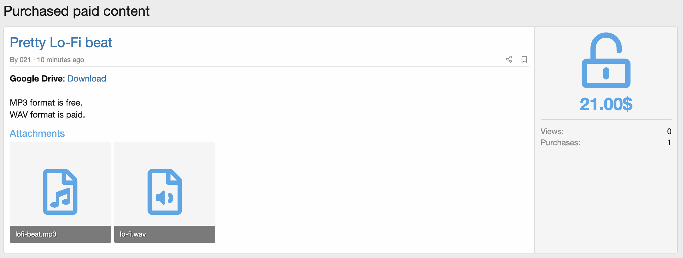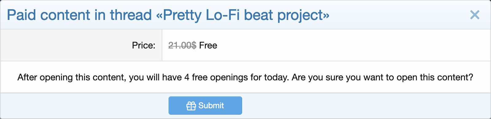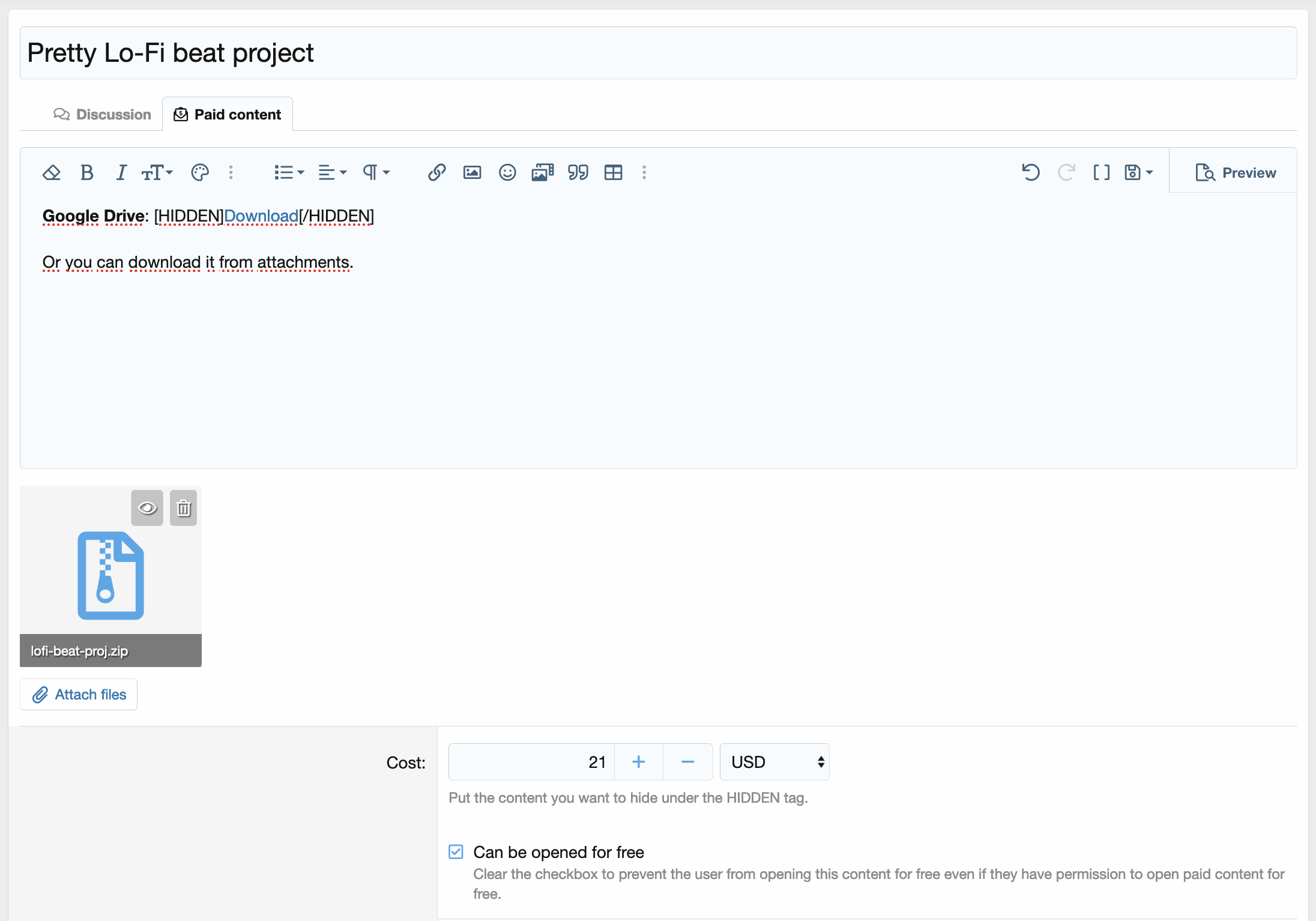 HIDDEN tag, set the price and get paid for every view of your content. Thus, you can hide not only text, but also attachments, for which there is a button on each attachment (Note: previews of images that have been hidden in this way will still be available).The add-on also provides for the existence of a paid upgrade, by purchasing which the user will be able to view all paid content on the forum (or content in certain forums). You can also set permissions (view paid content, create threads with paid content, purchase paid content) for each forum, member, group, etc.