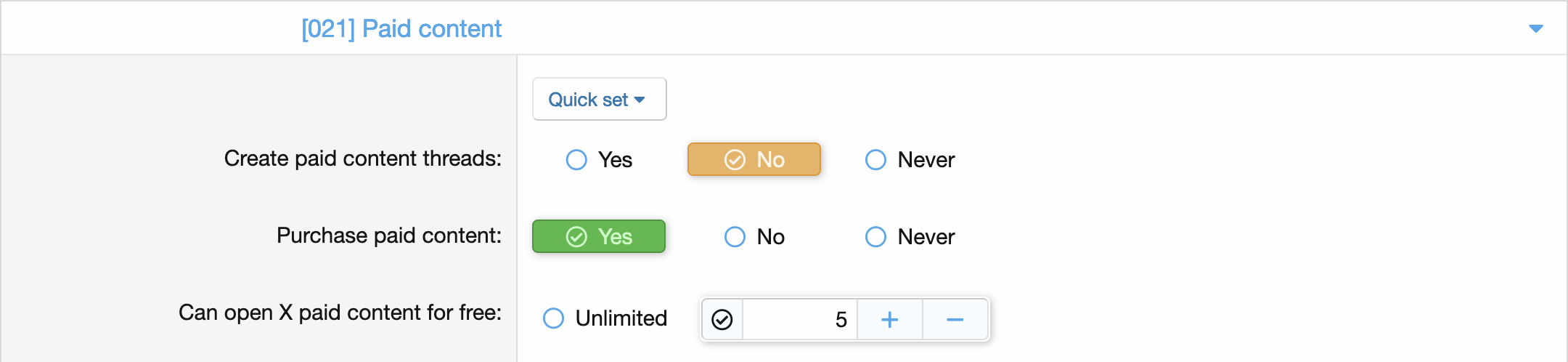 The add-on also provides for the existence of a paid upgrade, by purchasing which the user will be able to view all paid content on the forum (or content in certain forums). You can also set permissions (view paid content, create threads with paid content, purchase paid content) for each forum, member, group, etc.
