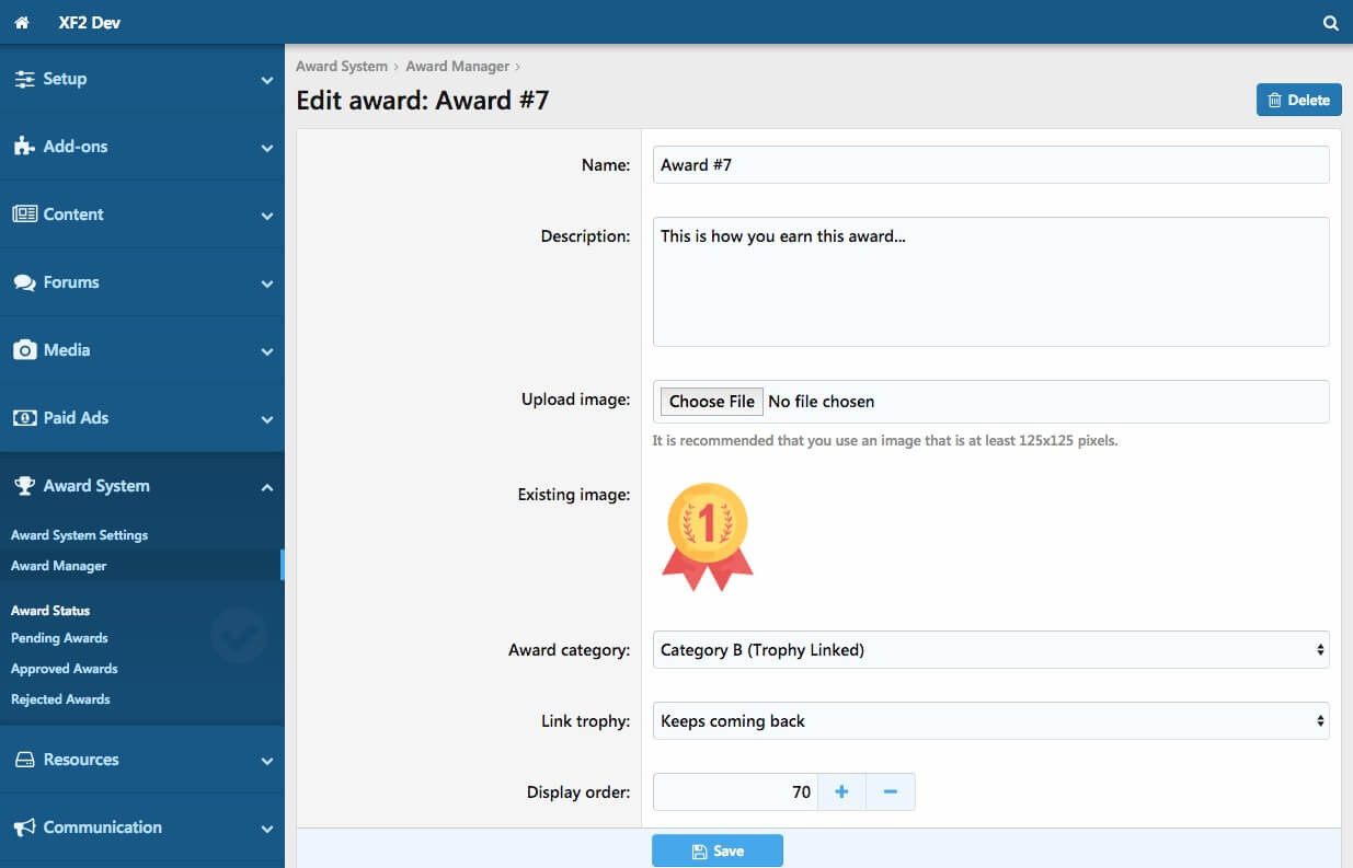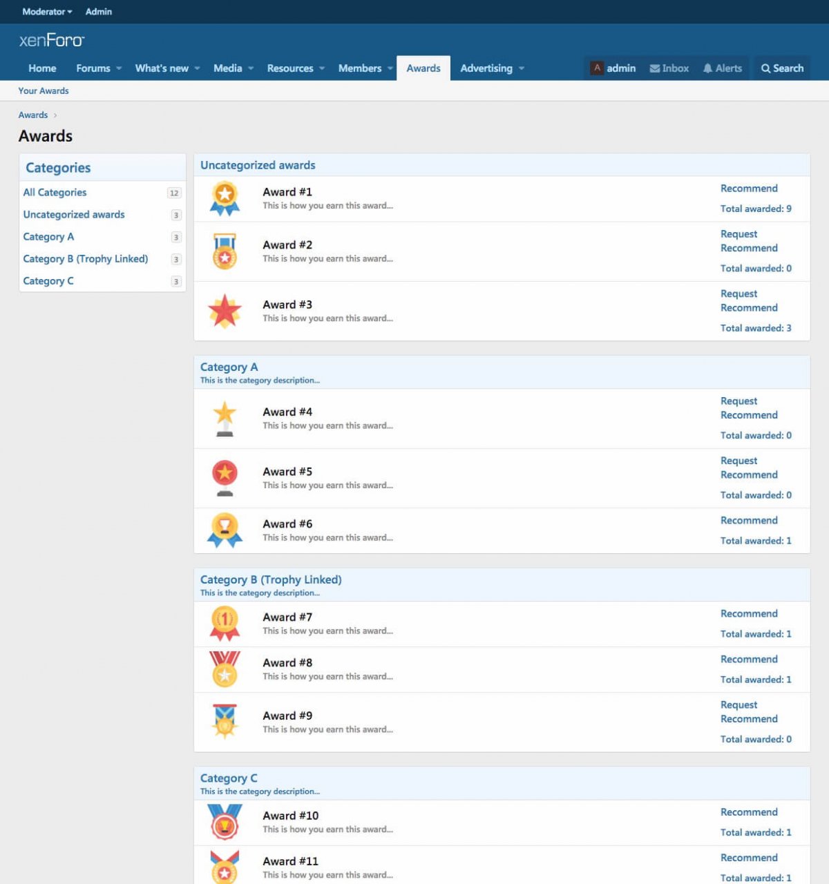 The built-in XF Trophy System is no longer necessary to use the auto-award feature. Awards now have their own criteria options. The criteria will automatically be copied for awards with linked trophies when upgrading to this version