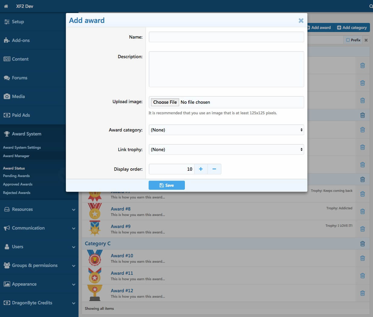 Simply link awards to XF2's trophy system, and it'll take care of the rest.