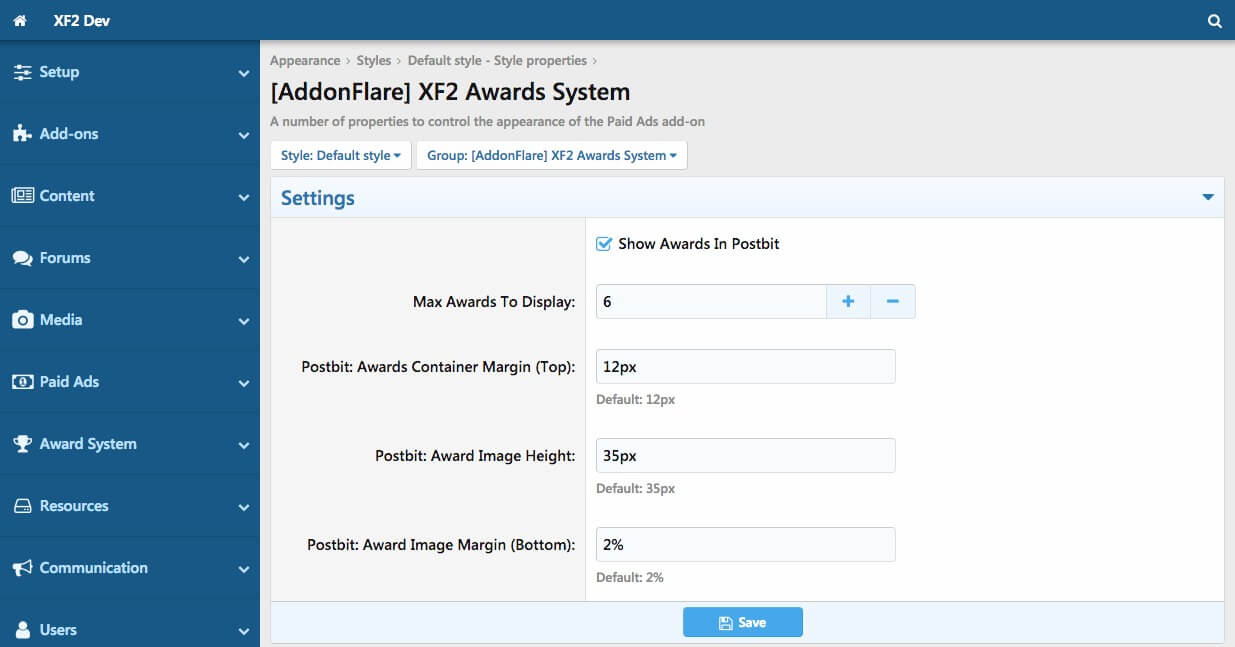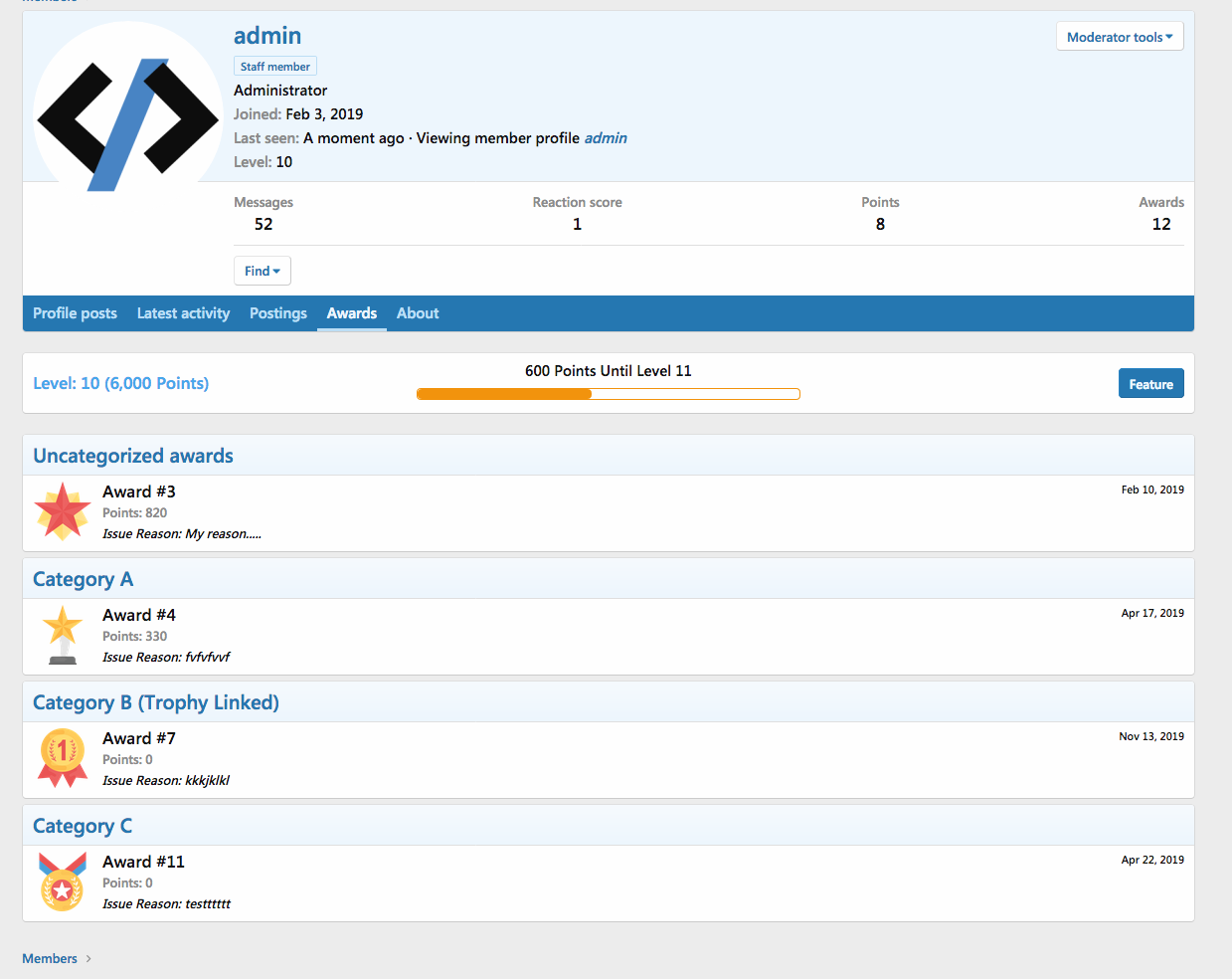 - Carousel postbit display mode: Show postbit awards in an auto-cycling carousel. This is now the default mode but can be changed through style properties in AdminCP