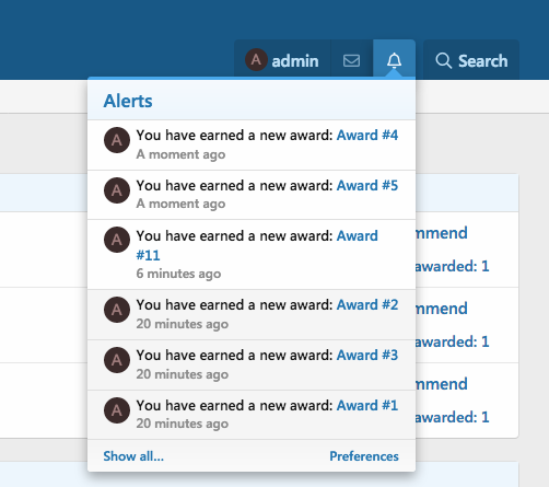 - Levels system: assign points for each award and control how many points are required to level up (supports incremental amounts)