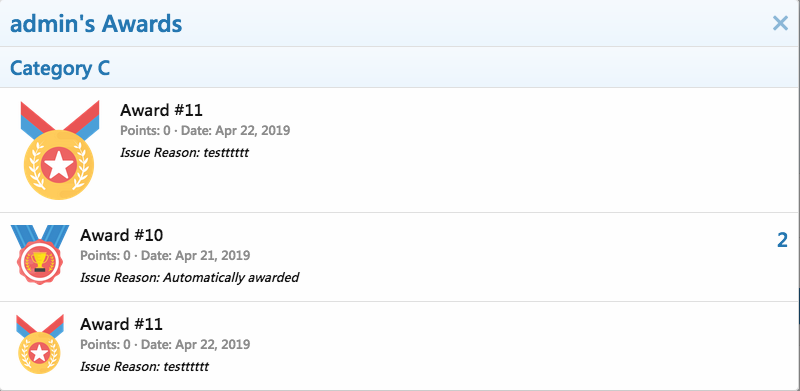 If checked, awards in the category will be replaced by the last award the user receives from the category. Users will only be able to have one award from the category at a time. (Special thanks to @Gsk8 for sponsoring this feature)