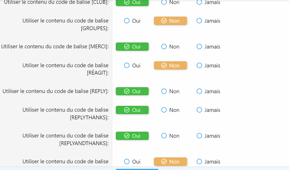 [REPLY]jeux[/REPLY] lorsque l utilisateur repond au message, le contenu ne s affiche pas diectementEn plus j ai installe la version 2.2.6 mais noua n avons pas les memes balises pourquoi ?Non dans la traduction.