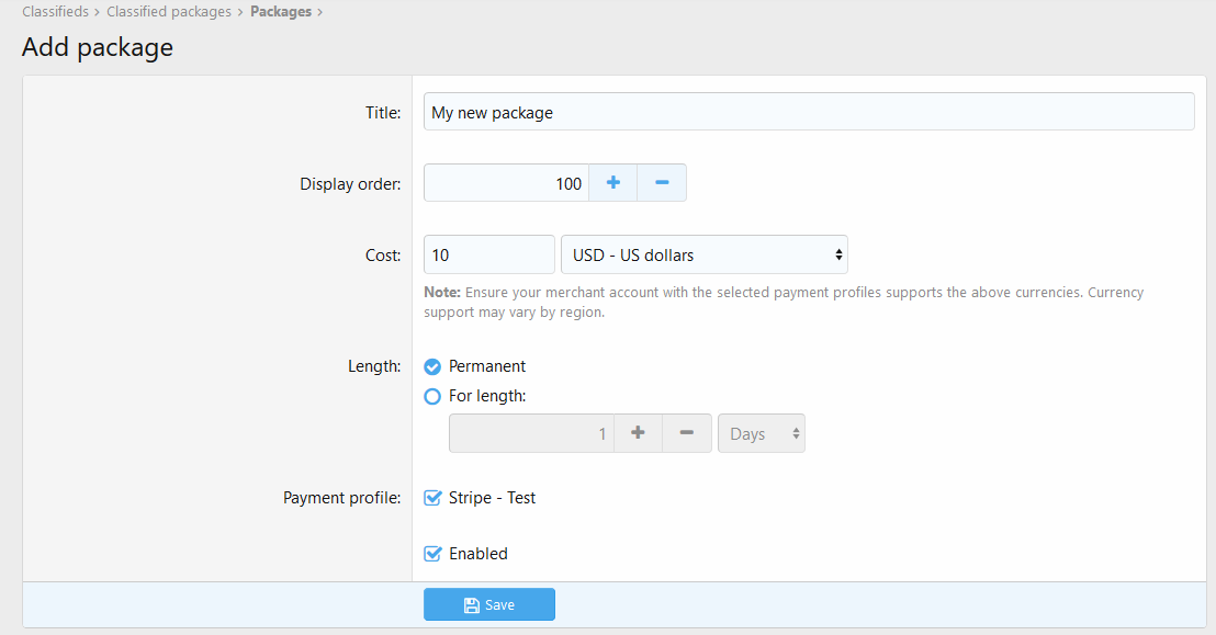 - Packages can be created to charge for listings at varying price points and configure the length of time a listing should be live until it expires.