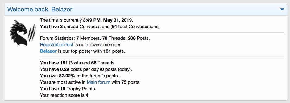 A block above your normal forums, the Welcome Panel provides a range of stats important to your members such as their post count, % of total forum posts they have, new posts, unread conversations, etc.