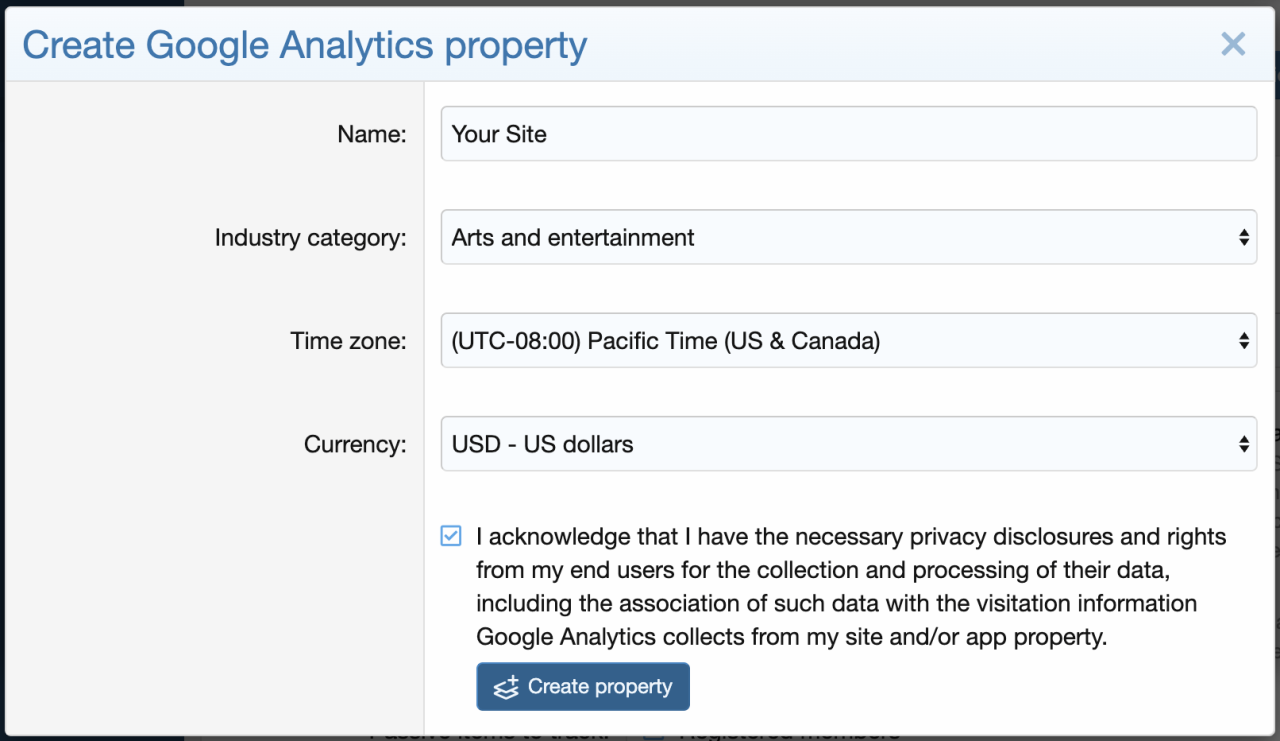 - You need to link your Google Analytics account and pick your property under Admin -> Options -> Analytics