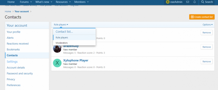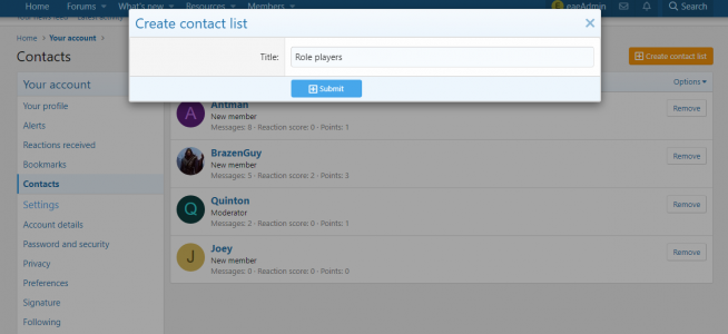 This add-on allows your members to create and maintain multiple contact lists that can be used when creating a new conversation or thread. Contact lists can be useful for admins to start a personal conversation with all their moderators at once, or all their sponsors, etc. It's also useful for normal members that want to maintain contact lists for friends, or for members they consistently role play with, or to contact all staff, etc.