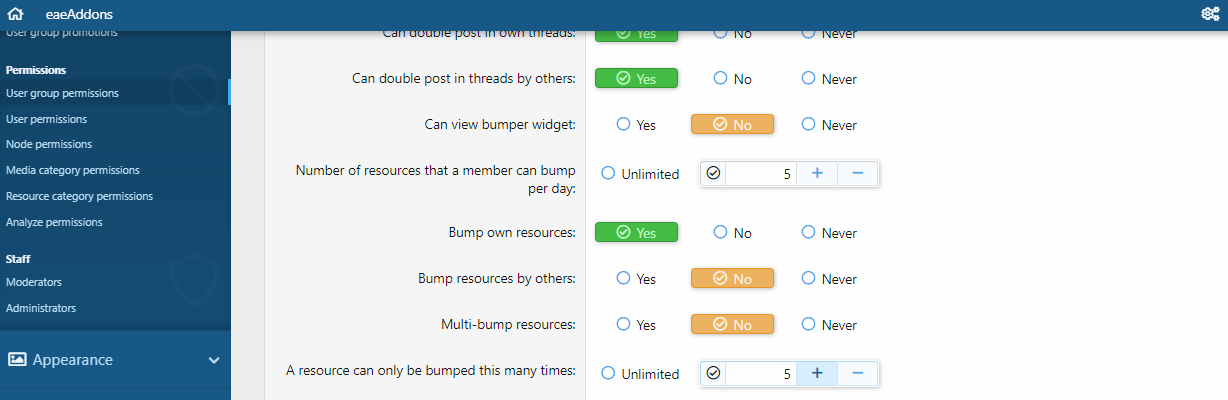 - Number of resources that a member can bump per day (general, user group): This should be set to one if you allow multi-bumping to prevent excessive re-bumping of x amount of resources.