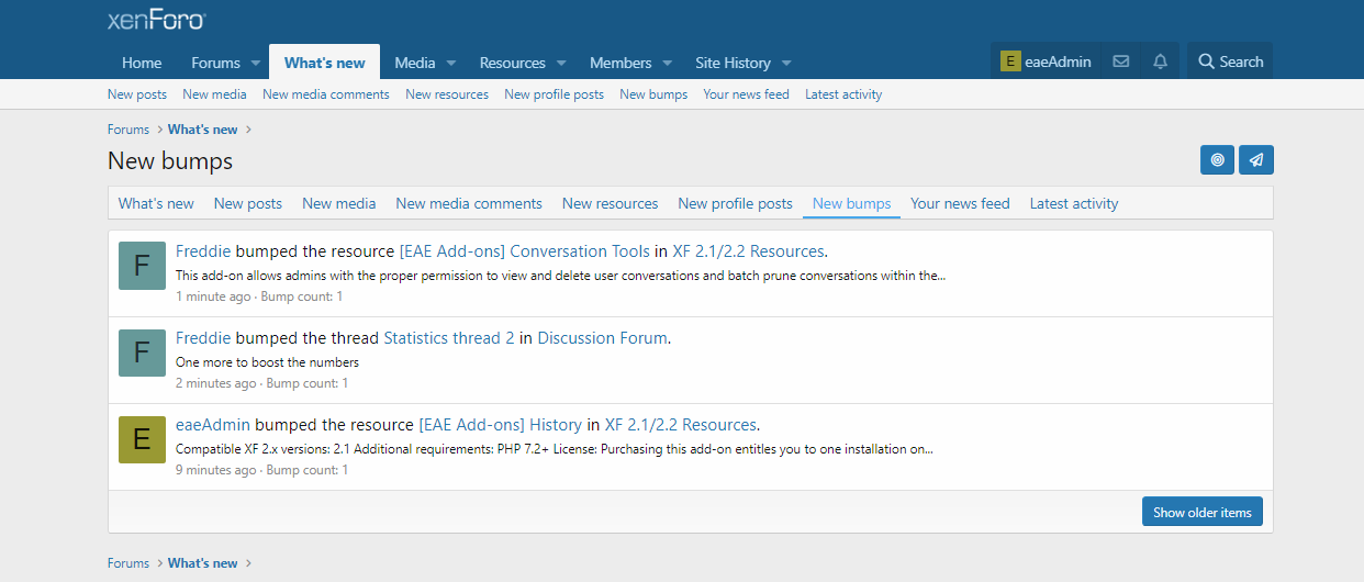 - Bumper statistics (AdminCP -> Content -> Bumper statistics): Here, admins with the View statistics admin permission can view a list of active and expired resource bumps, with bump counts. You can also choose to expire selected active bumps or all active bumps.