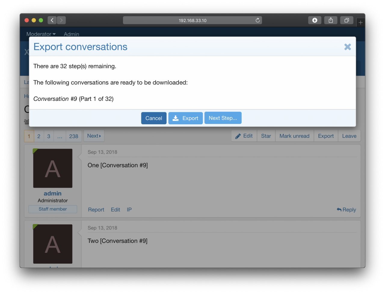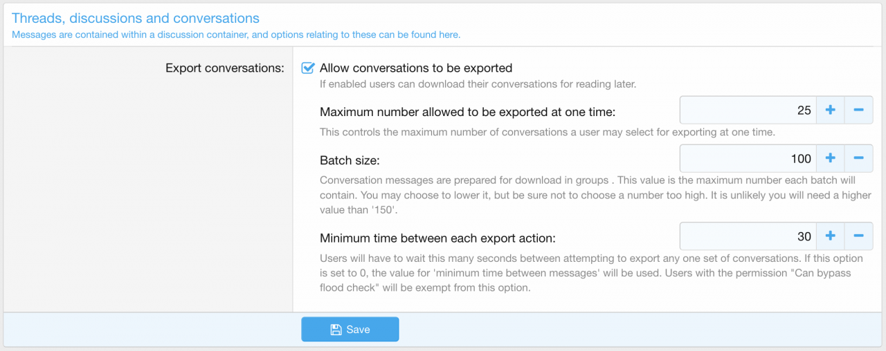 A user is also able to select multiple conversations to be exported at once using the inline tools on the conversation list (the number permitted to be selected can be controlled within the options).