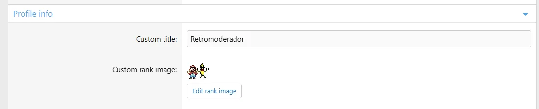 Administrators can assign images from the admin panel, and moderators with the "Edit basic user profiles" permission can do so from the front-end profile editor. Users can also upload their own if granted the "Edit own custom rank image" permission.