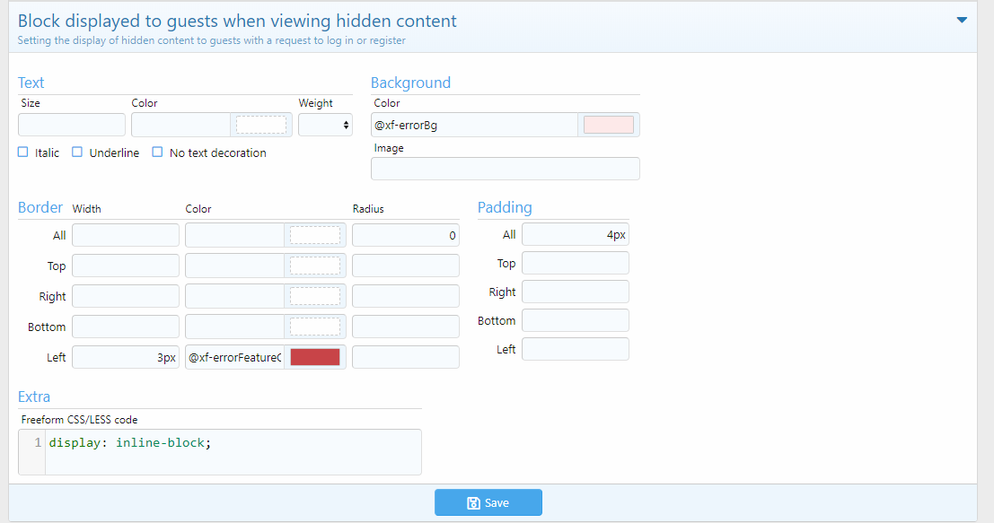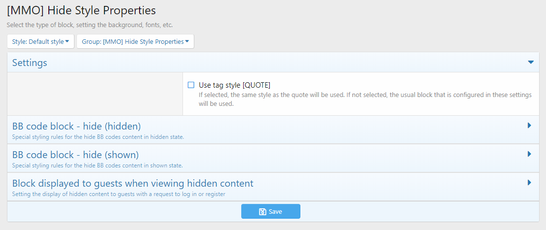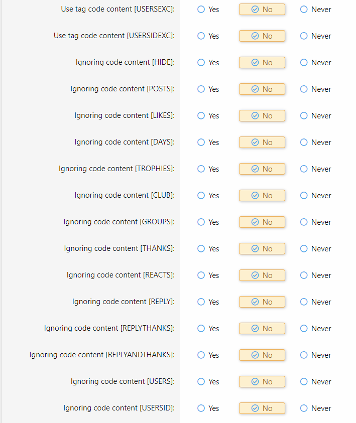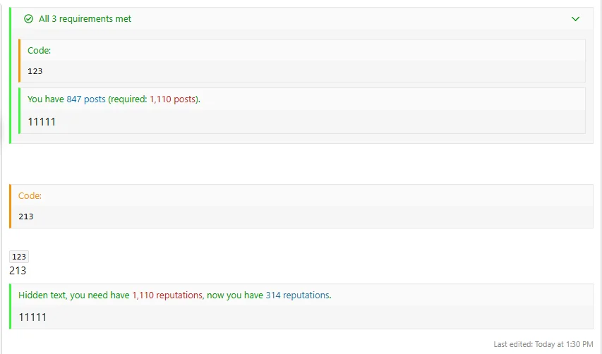 [HIDE]Hello World![/HIDE] - only registered users see the hidden text[HIDE=(posts > 1 or likes > 1)]Hello world![/HIDE] - The hidden text "Hello world!" will be displayed if the number of user posts is greater than 1 OR the number of likes is greater than 1.[HIDE=(posts > 1 and likes > 1)]Hello world![/HIDE] - The hidden text "Hello world!" will be displayed if the number of user posts is greater than 1 AND the number of likes is greater than 1.[HIDE=(days > 1 or user_state == "valid")]Hello World![/HIDE] - The hidden text "Hello World!" will be displayed if the number of days since user registration is greater than 1 OR the user state is "valid".[HIDE=(isMemberOf(2) or trophies >= 0)]Hello World![/HIDE] - The hidden text "Hello World!" will be displayed if the user is a member of group 2 OR the number of user trophies is greater than or equal to 0.[HIDE=(is_staff)]Hello World![/HIDE] - The hidden text "Hello World!" will be displayed if the user is a staff member.Security and how safe is the use of such a wide range? Yes, it is completely safe, and for expression interpretation, the addon does not use eval.