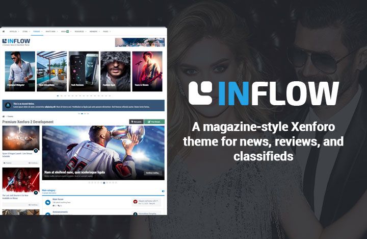 Inflow is a responsive content-drive theme, great for magazine-style websites centered around news, reviews, or classifieds. Works great with XenPorta 2 to produce a fantastic CMS appearance around your articles and featured threads.