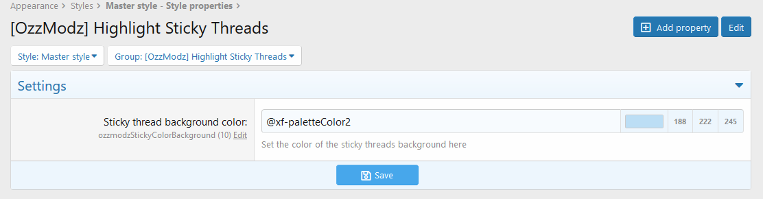 This small addon will allow you to set a different background color for sticky threads on the forum view page. It is settable by a style property.