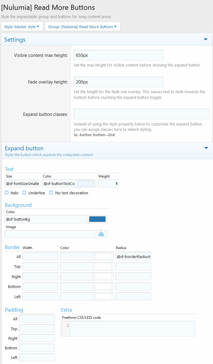 A: After install, go to Admin -> Options -> [Nulumia] Read More Buttons for settings and permissions