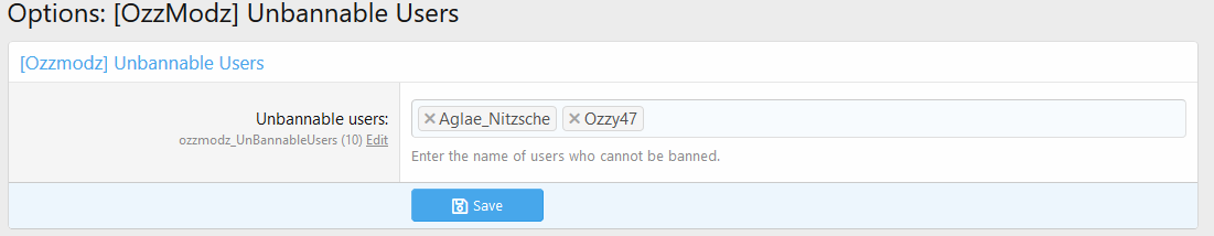 This small addon will allow you to enter users in the addon options to be unbannable. Even if the user exceeds the warning points threshold they will not be banned.