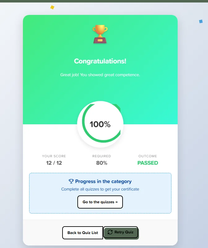 THE KILLER FEATURE: Certificates: Automatically issue beautiful, downloadable PDF Certificates to users who complete a quiz or an entire category. A massive incentive for your users!