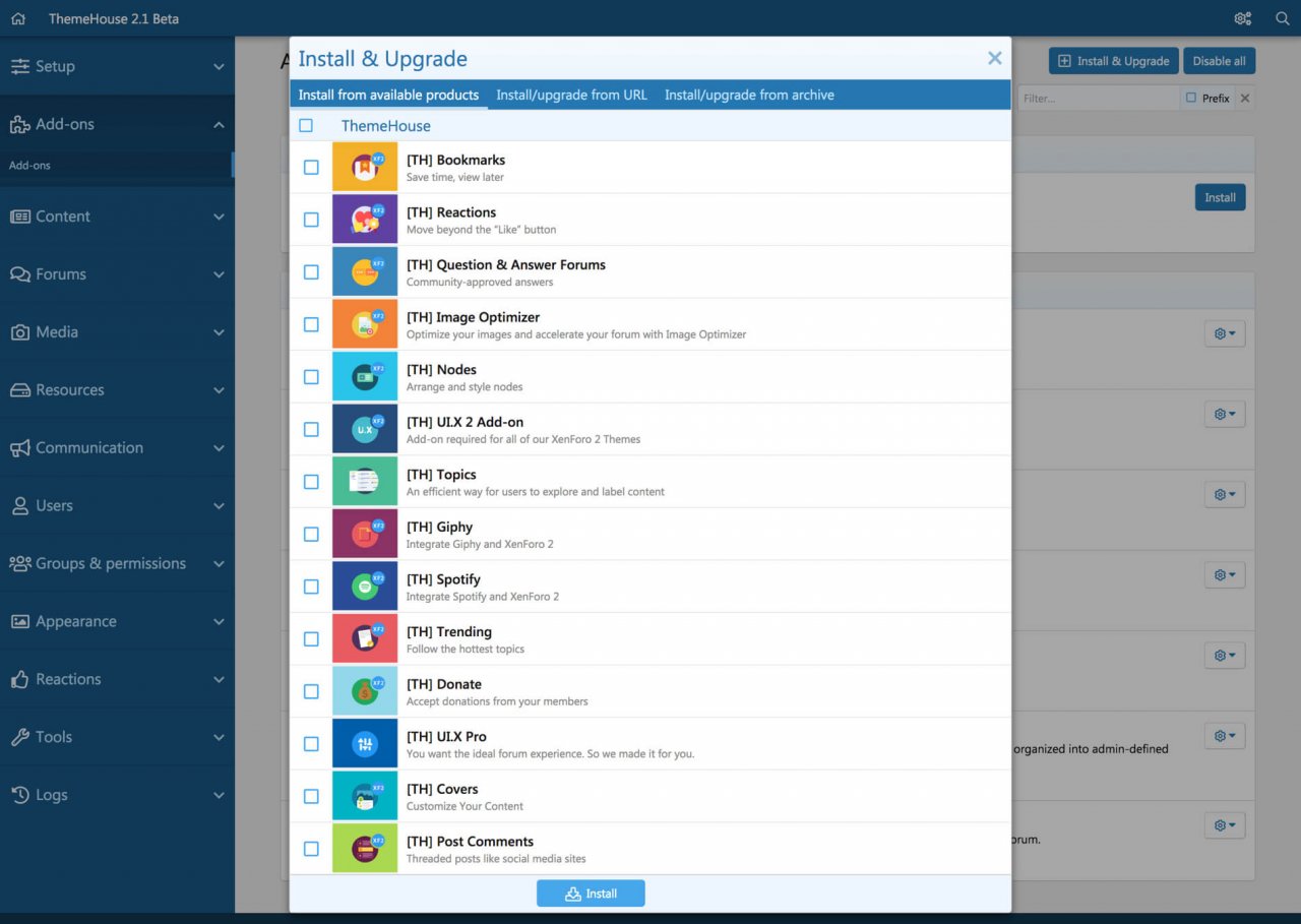 - Easily view what ThemeHouse (using your API key) or 3rd-Party add-ons, themes, and languages you want to install or upgrade