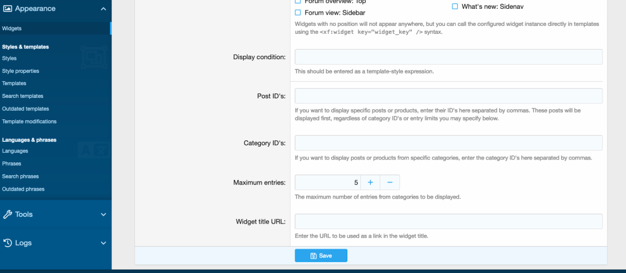 Use simple widget settings to limit the number of entries per widget, link back to your WP blog, and set custom post and category IDs to tailor each widget to its rightful place throughout your forum.
